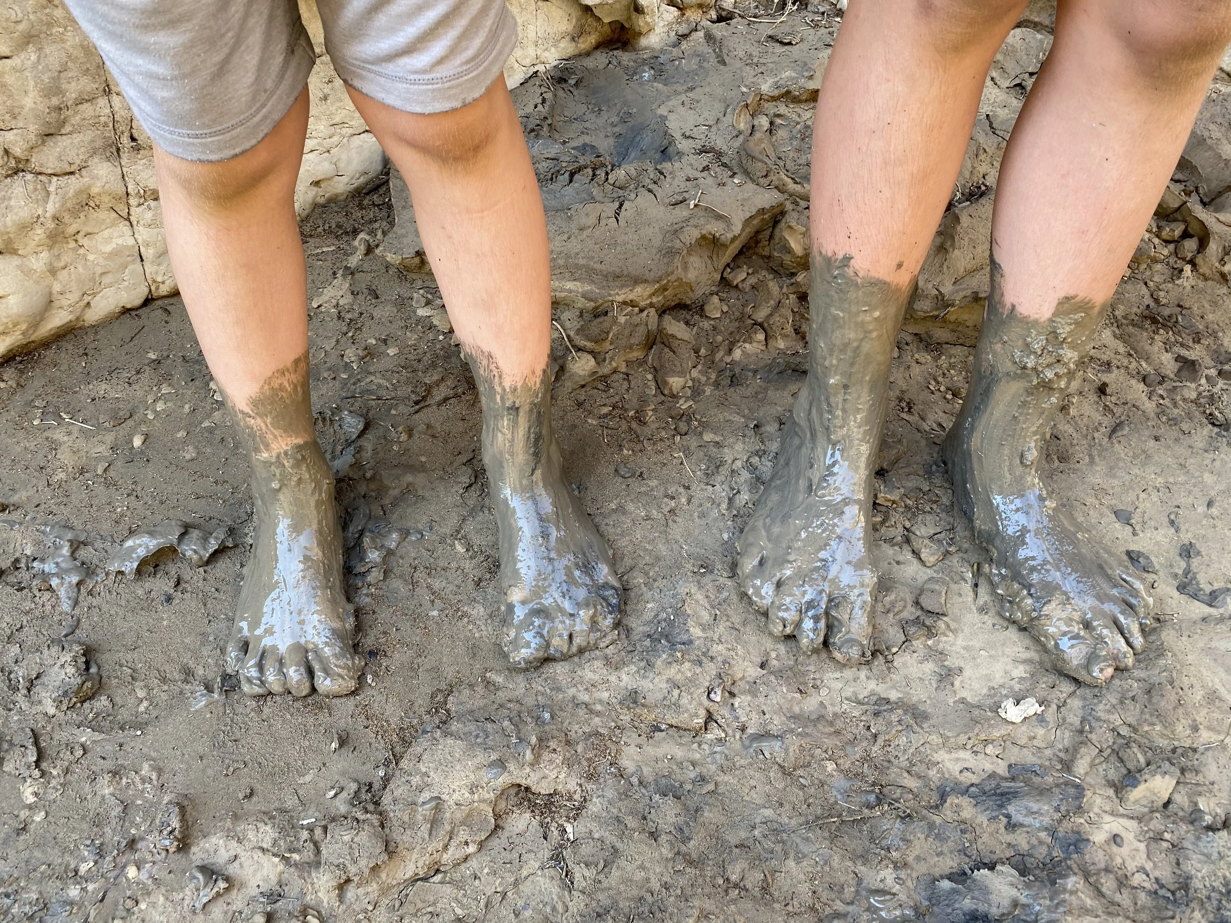 Where are you going, Amelia? Okay, have fun in Mexico. Could you send me a postcard? You can do it, mom, you can do it. I believe in you. Everybody needs some belief today. Let me take a picture of your feet. I want to step in the mud. It's all going to wash away. We can clean them once we get everything. You're going back.