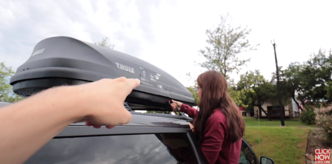 We got a new roof rack to hold luggage. We ordered it from Amazon, and it arrived in this huge box. It says to check the latch points. I'm not sure if you all see it because it's locked. From what I understand, you can't close it or leave it unlocked. When we open it, there are the mounts for when you mount it to your roof rack. We didn't bring any suitcases with us on this trip, so that's something new we're trying out, We're using Pecking cubes instead of suitcases, and each day is a different Cube. This is a hiking bag, a church bag, and a cold-weather bag. That's all we need,