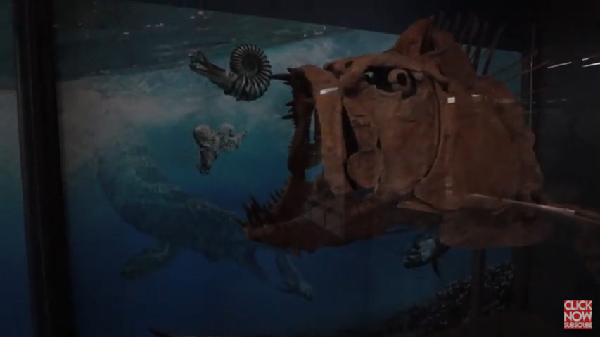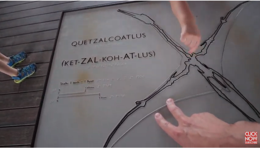 We all need a picture. What do you see, Beckett? Can you say pterodactyl? Yeah, pterodactyl. That's right. It's called Quetzalcoatl. So when they found the dinosaur bones, they were so big that they had to get a helicopter and airlift their bones. That is crazy. These dinosaur names are hard to say. Zyfactinus. That is cool looking.